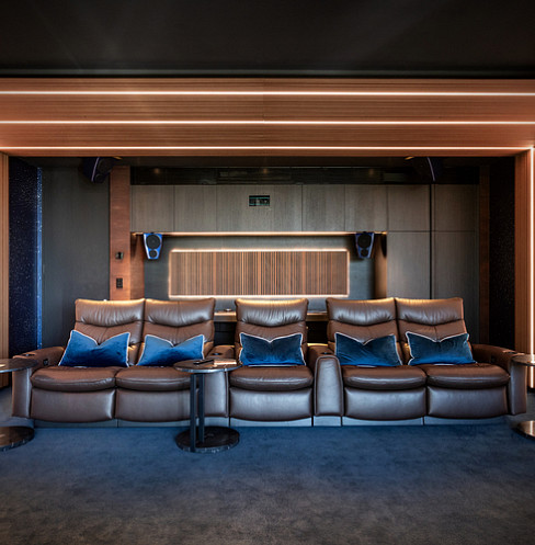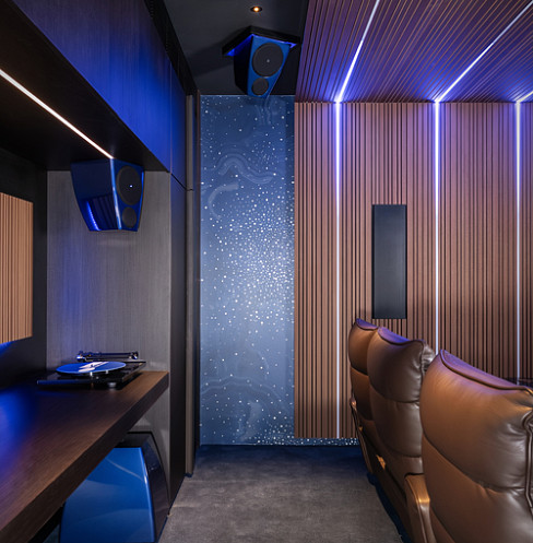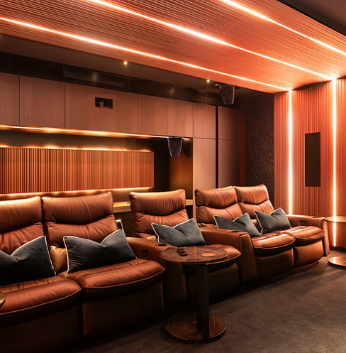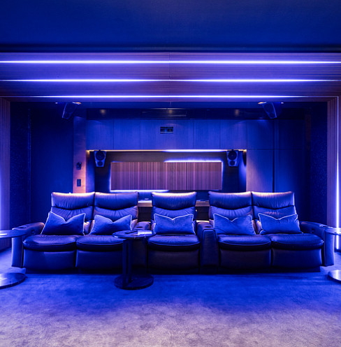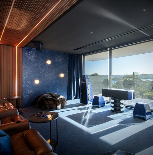 Blue Note is an immersive media room created for a long-time client who values performance, design, and individuality in equal measure. Located in a Sydney home carved into a sandstone cliff, the room needed to serve two purposes: a reference-quality cinema and music space, and a functional home office for everyday use.
