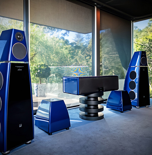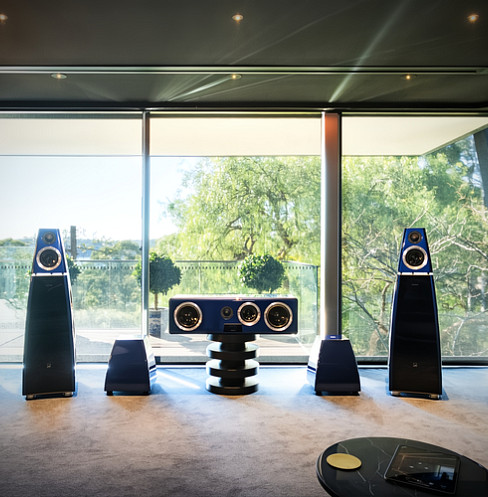 Floor-standing speakers and tailored window treatments allowed the view to remain while supporting strong audio performance.