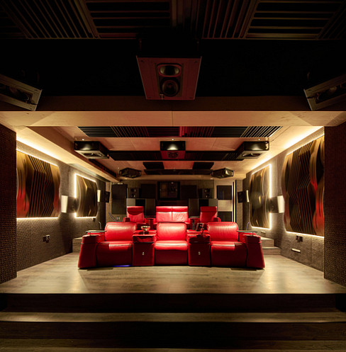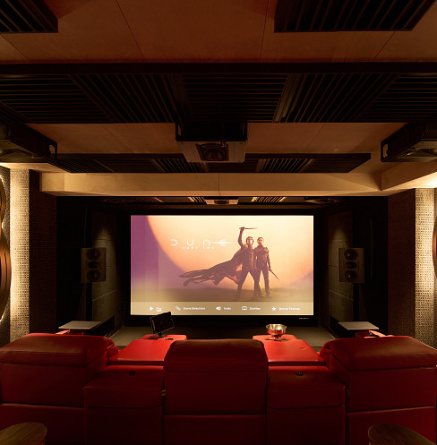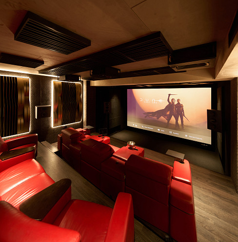 The room was designed from the ground up around cinema-grade audio, projection, and acoustic standards.