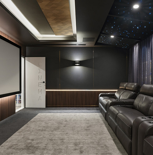 Skyline Cinema comenzó como parte de un proyecto de construcción de una vivienda, y el cliente se puso en contacto con Wavetrain Cinemas antes de que se finalizaran los planos de construcción. Habiendo vivido anteriormente en Hong Kong y más tarde en Singapur, el propietario quería que su cine se pareciera más a un apartamento de lujo con vistas al horizonte de la ciudad por la noche que a una sala de cine tradicional cerrada.