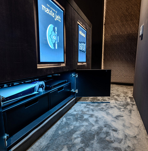 Custom wall depths and precise angling allowed speakers to perform correctly without changing the room’s proportions.